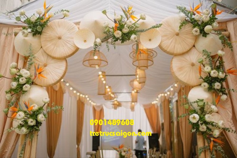 Trang trí cổng cưới bằng hoa lá kết hợp cùng những chiếc nón lá tạo nên khung cổng đẹp và ấn tượng